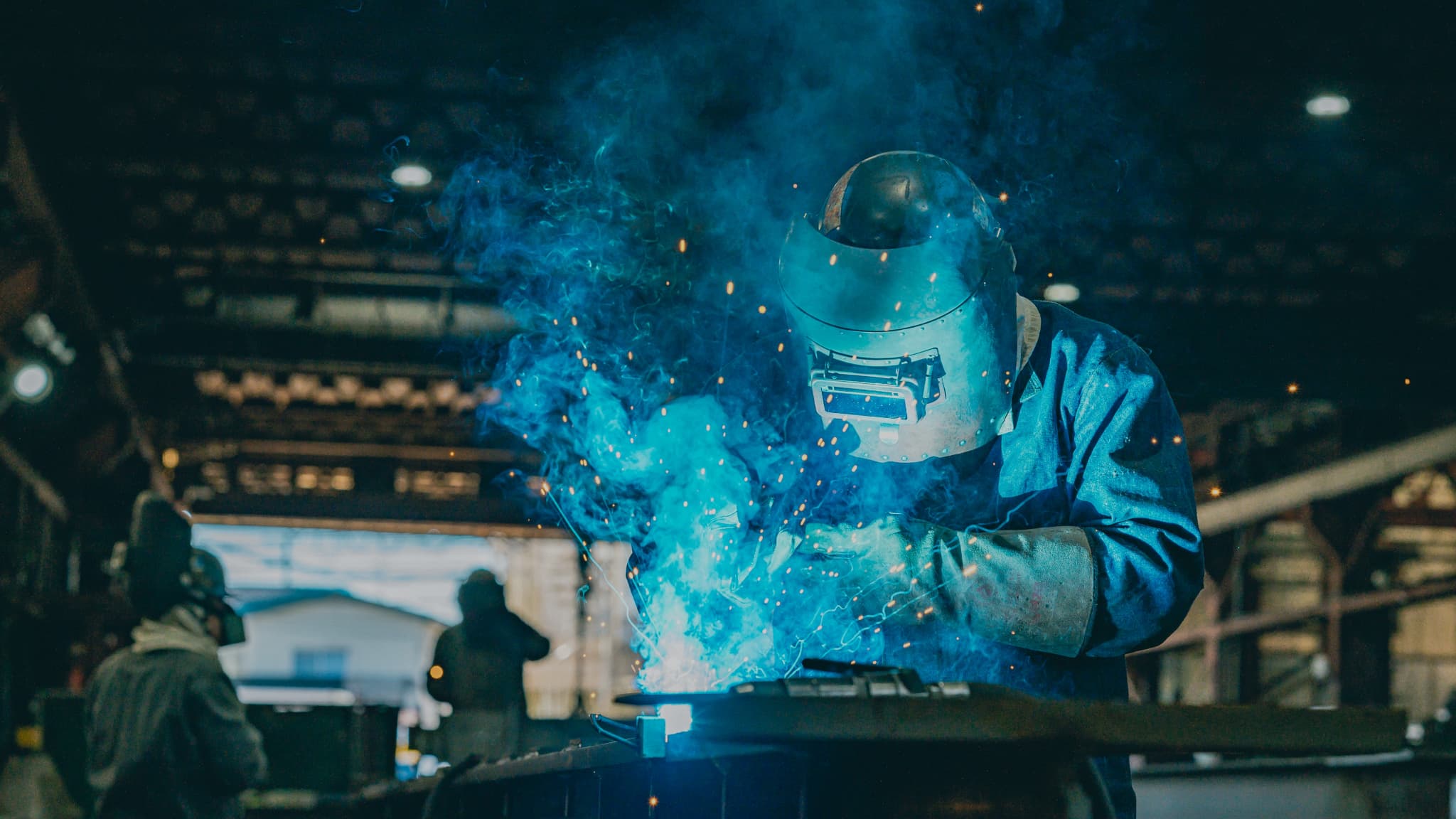 組み立てられた素材部品を、人の手によって、一つ一つ溶接しながらつなぎ合わせていきます。
