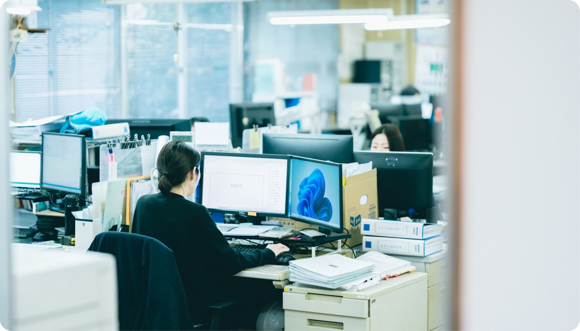 総務部経理、人事、社員の働きやすい環境整備、福利厚生など、会社管理に関する事務全般を担っています。